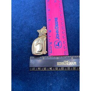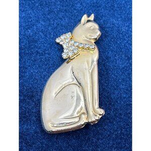 Elegant gold-tone cat brooch featuring a sparkling rhinestone collar. Ideal for accessorizing jackets, bags, or scarves for a sophisticated touch.