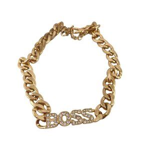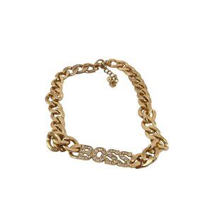 This captivating necklace presents an embodiment of boldness and elegance, crafted with a gold-tone chunky chain that exudes a sense of opulence and strength. The highlight of this remarkable piece is the "Boss" pendant, adorned with shimmering rhinestones that catch the light in a dazzling display. It is a statement piece that commands attention and admiration, perfect for those who wish to express their individuality and confidence in a stylish manner.