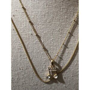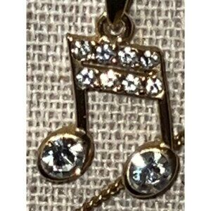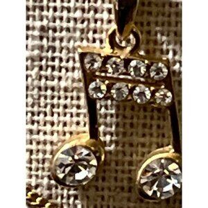 Gold-Tone Crystal Music Note -- 18". A music note hangs on a gold-tone strand with balls stationed on a chain. The other chain hangs below the first. The crystals are bright, shiny, and clear. Please note that this necklace is in excellent pre-loved condition. Measurements: Length: 18"; Pendant: 1/2".