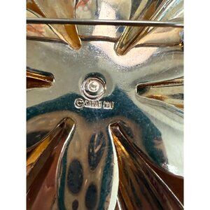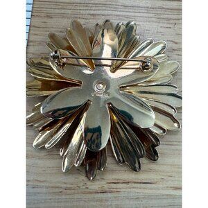 A chic vintage-style flower brooch with a bright gold-tone finish. Its timeless floral design and Sarah Cov signature make it a collectible accessory.