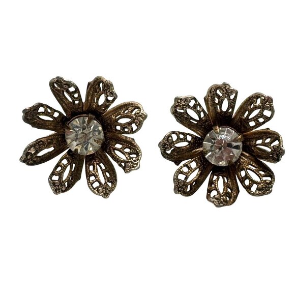 These vintage gold-tone earrings boast a mid-century floral design with rhinestone centers, offering timeless elegance and a touch of antique charm.