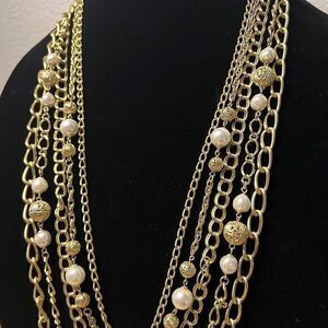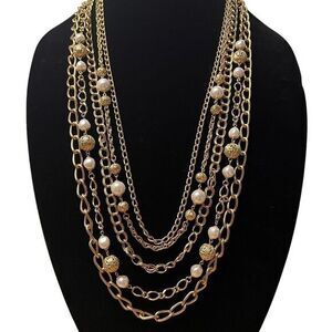 Gold-Tone Faux Pearl Bead Multi Chain Statement Necklace 34.5 in 5 Strand