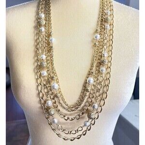 Gold-Tone Faux Pearl Bead Multi Chain Statement Necklace 34.5 in 5 Strand. Add a touch of elegance to any outfit with this stunning multi-chain statement necklace. The necklace features a beautiful gold-tone finish and is made up of five strands that create a layered and beaded style. The necklace measures 34.5 inches in length, making it the perfect accessory for any occasion, whether it's an engagement, graduation, anniversary, birthday, or any other special event. This necklace is a must-have for anyone who loves to accessorize with style and sophistication. The metal purity and type are unknown, but this doesn't detract from the beauty and quality of the necklace, allowing the focus to be on the stunning design and the faux pearl beads. "Please note that the color of the item may vary due to reflections from different lighting sources." Please check the photos and measurements carefully before placing the order. Very good pre-owned condition.
