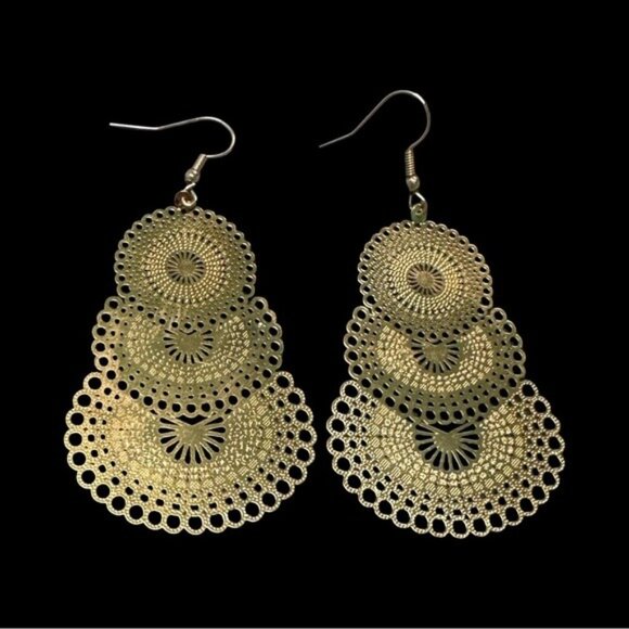 These gold-tone dangle earrings feature a delicate filigree design, offering a lightweight yet striking accessory. Suitable for both casual and formal occasions.