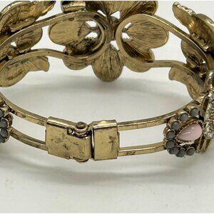 This elegant vintage-inspired bracelet features a floral design with rhinestones and faux pearls on a gold-tone hinged band. A timeless accessory with classic appeal.