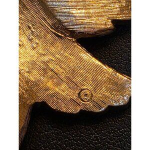 Elegant gold-tone hummingbird brooch with intricate detailing and a striking eye accent. A timeless accessory to elevate any attire.