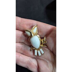 Gold-Tone Owl Brooch Pin With White Milk Glass Cabochons Vintage Adorable Bird J