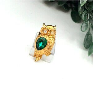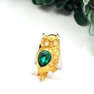 Elegant lapel pin featuring a gold-tone owl design with a striking green gemstone and crystal eyes, adding a refined touch to your attire.