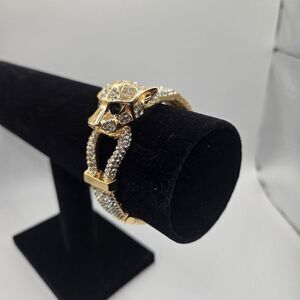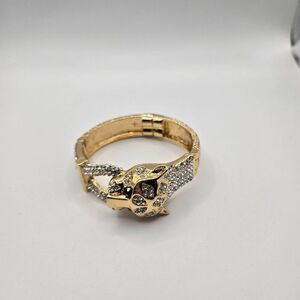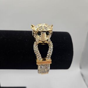 This striking bracelet features a gold-tone panther head adorned with rhinestones. It combines elegance and bold design, ideal for enhancing formal or evening wear.