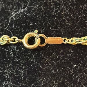 This elegant gold rope chain necklace adds a touch of sophistication to any outfit. 18” chain, has greening on metal and could stand to be cleaned up.