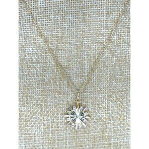 A stylish gold-tone necklace featuring a radiant sunburst pendant with rhinestones. The 18-inch chain adds refined elegance to accessorize outfits.