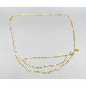 This gold-tone belt exudes elegance with its layered design and intricate floral medallion accents. A versatile accessory that enhances outfits, offering both style and function. Its adjustable chain ensures a comfortable fit, making it suitable for various body types. Ideal for adding a touch of glamour to your ensemble.