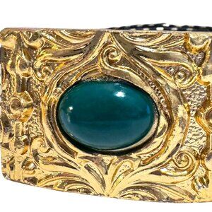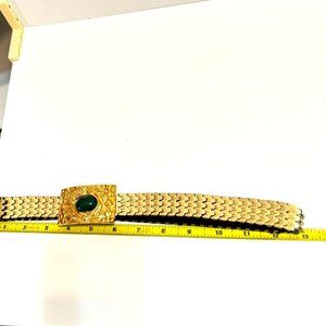 Crafted with precision, this vintage belt features a gold-tone scale design and an ornate buckle with a green cabochon, offering timeless elegance.