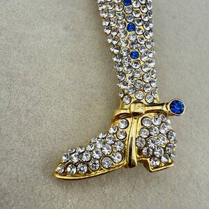 Gold-Toned Rhinestone Boot Brooch With Blue & Clear Crystal Accents Pinback Jewe