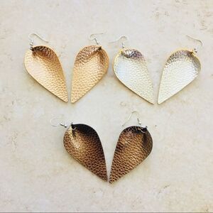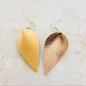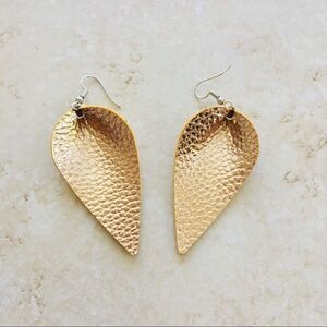 Gold Vegan Leather Leaf Earrings NWT is a brand new boutique item. Gold vegan leather drop earrings are a fabulous finish to any Fall outfit. Measurements in photos. Other colors available. Bundle for shipping & item discount.