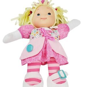 Introducing the Goldberger Zippity Princess My First Doll, a collector toy that is a perfect addition to any doll collection! This 12-inch girl doll has blonde straight hair and blue eyes, with a light complexion. The doll is made of durable cloth, plastic, and fabric materials, and weighs 0.5 lbs. This vintage licensed reproduction doll from the Giggles franchise is suitable for all occasions and age level of 2 years and above, for both boys and girls. The doll comes without packaging and is a single unit for sale. It features a Baby's First character and includes a doll set of 1 piece. Add this Caucasian baby doll to your collection today and bring joy to your little one!