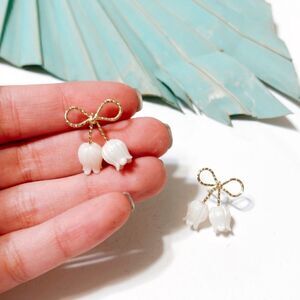 White flower drop bow stud earrings in gold tone hardware
