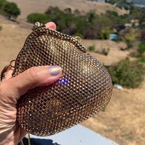 Elegant sparkly and fund evening bag totally covered in elegant gold crystals, black satin lining and long elegant gold chain strap.