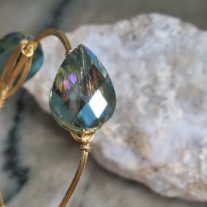 Unveil a world of elegance and shimmer with our Golden Aurora Wire-Wrapped Bangle, adorned with iridescent faceted crystals. This handcrafted bracelet captures the essence of beauty and sophistication. Each bead, with its multifaceted surface, refracts light in a dazzling array of hues, ranging from deep emeralds to azure blues, reminiscent of the mesmerizing dance of the Northern Lights. Skillfully set against a lustrous gold-tone wire frame, the crystals offer a striking contrast, both in color and texture. The intricate wire-wrapping technique adds an artisanal touch, ensuring that each bangle is unique and holds its own story. Perfect for elevating any ensemble, be it casual or formal, this bracelet is a testament to timeless elegance infused with a modern twist. Indulge in the magic of iridescence and craftsmanship with this exquisite piece.