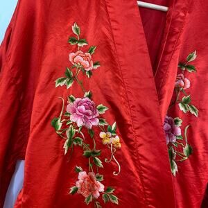 Golden Bee Vintage Hand Embroidered Asian Floral Silk Kimono Robe Red Size L