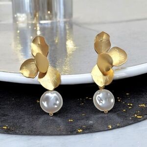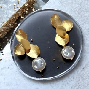Golden blooms earrings, pearl drop earrings, vintage dangle earrings, timeless elegance jewelry, faux pearl earrings, gold plated earrings, sterling silver ear needle, 925 sterling silver earrings, flower petal earrings, lightweight earrings, floral earrings, statement earrings, bridesmaid earrings, wedding earrings, elegant drop earrings, gold-tone earrings, hypoallergenic earrings, women’s fashion earrings, vintage-inspired jewelry, sophisticated earrings, formal event earrings, trendy jewelry, high-quality earrings, floral design earrings, classic earrings with pearls, stylish earrings, handmade earrings, unique jewelry design, luxury earrings for women, holiday gift, birthday gift for her, festive gold jewelry, trendy