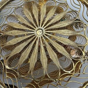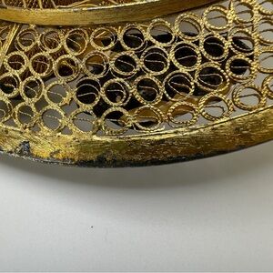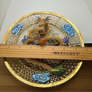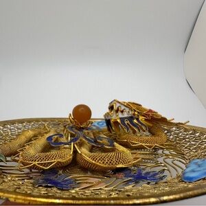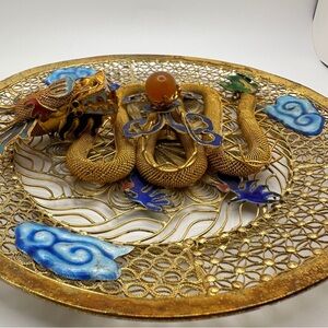 This intricate piece is crafted from copper with gold-tone filigree and features a detailed 3D dragon design. The dragon is adorned with enamel in vibrant colors, characteristic of cloisonné work. Cloisonné is a decorative art form using enamel and metal wire, often on copper or bronze, to create intricate designs. For antique pieces, consider craftsmanship, enamelwork, color vibrancy, and signs of age.