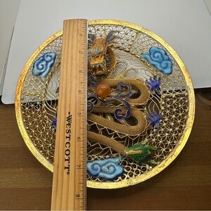 The plate showcases a heavenly dragon with a fireball and clouds, all rendered with fine, intricate details. Elevate your decor with this exquisite golden and blue dragon piece of art. See photos for approximate measurements. Happy to answer any questions!
