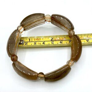 The bracelet features 6 stunning golden-brown translucent color curved rectangular crystal segments alternating with round crystal beads. Beads are made of natural quartz crystal. They are strung together with an elastic band, making it easy to slip on and off, and perfect for both men and women. Comes with a red hard shell box.