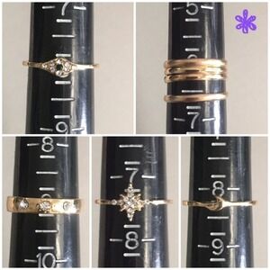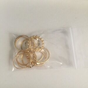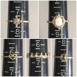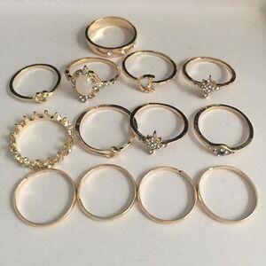 13 piece boho trendy knuckle ring set. Faux blue opal in one ring, CZ crystals in select other rings. Ring sizes vary 6 to 9 (specific ring sizes are shown in photos, the rings indicated by the purple star are adjustable). Rings are sold as a set (cannot be separated). Material is a golden toned zinc alloy. Keep dry and away from oils and lotions