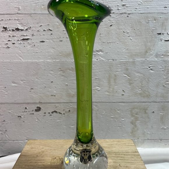 Golden Crown E&R Sweden Green Clear Art Glass Tulip Shape Bud Vase with Label
