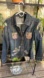 Dark wash denim jacket is hand painted with full dragon on left sleeve and “Shielded” printed on the back with more dragon detailing. Metallic detailing on throughout.