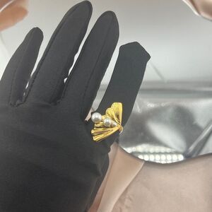 Adorn your fingers with the perfect blend of modern sophistication and timeless beauty. This adjustable ring features a gold-toned fan design complemented by a trio of luminous pearls, exuding elegance and charm. Ideal for special occasions or adding a touch of luxury to everyday outfits, this statement piece embodies refined artistry. A must-have for jewelry enthusiasts seeking bold, artistic expressions.