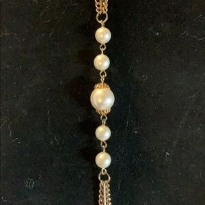 Golden Faux Pearl Long Necklace Multi Strands - One w/ Faux Pearls, 2 Chains, One Long Flat Link Chain - Really Pretty Vintage Piece