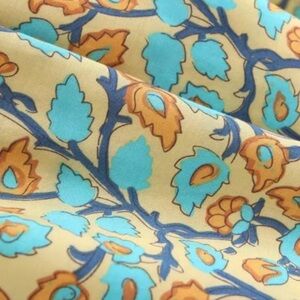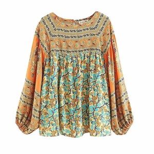 Golden orange floral printed boho style blouse with elastic hemmed long sleeves. Looks great style with jeans or your favorite maxi skirt!