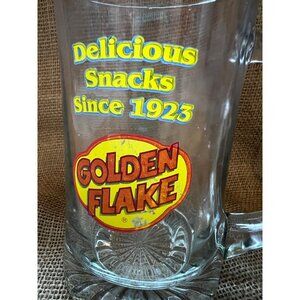 This is a Bundle of 2 Vintage Golden Flake Glass Tumbler Mugs with appx 20 fl oz capacity. One says, "Golden Flake, Delicious Snacks Since 1923", and the other says, "Golden Flake: Slam Dunk!"