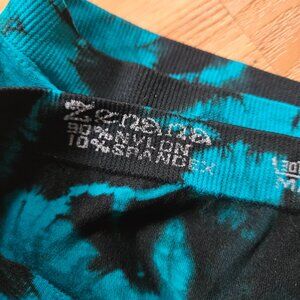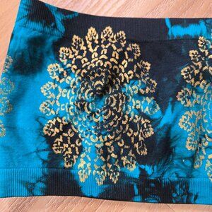 One-of-a-kind tie dye bandeau in teal and black with shimmering gold mandala design. Handmade tie dye + hand-applied design. One size fits Small–Large.