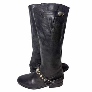 Black leather Golden Goose round-toe distressed riding boots with tonal stitching, silver-tone stud embellishments at tops, stacked heels, zip closures at sides and snap closures at uppers.