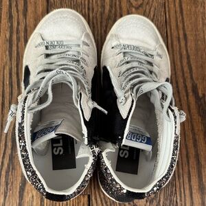 Chic high-top sneakers featuring a bold orange star. Black and gray design with speckled accents. Iconic Golden Goose style.