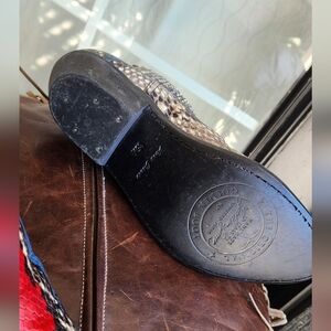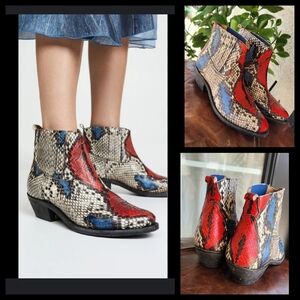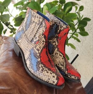 Stylish ankle boots with a vibrant snakeskin pattern. Features red, blue, and black accents.