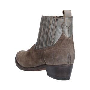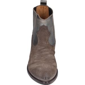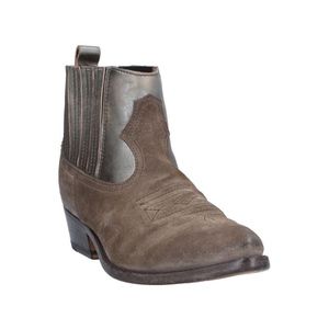 Western-inspired ankle boots are crafted of distressed brown suede and silver metallic calfskin