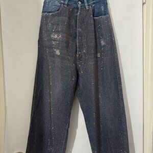 Wide Breezy high-waisted jeans entirely with small pink rhinestones intentionally distressed, worn 5 times.