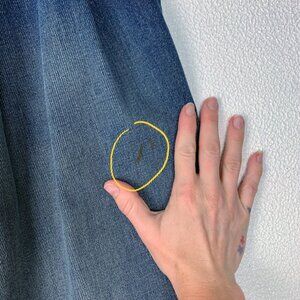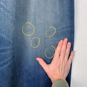 Multiple spots of discoloration, the majority are on the front and at the knee or thigh area. I don't know what the discoloration is, I held my steamer head to them and nothing lifted. However, none of the spots have stained the inside so they are superficial only. With some treatment they might lift.