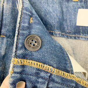 Flavia wide leg jean *patch pockets by Golden Goose. Dirty dark blue wash. Two side seam pockets and two back patch pockets. Waist pleat detailing. High rise. Hook and zip closure. Rigid denim.