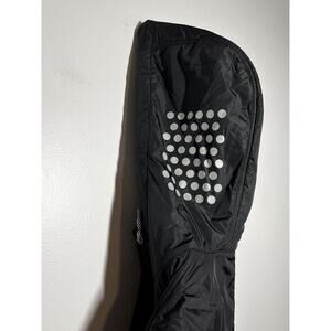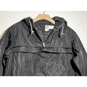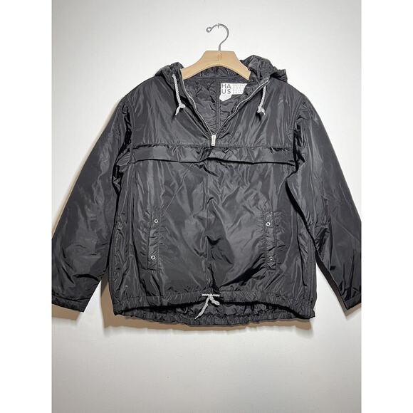 You are bidding on an Anorak from Golden Goose Haus , black, size M, excellent used condition. Attached hood with reflective detail, partial zip at chest. Zip pocket at waist, black and white ties at neck and hip. Measures 18" from shoulder to shoulder, 20.5" from pit to pit, 23.5" in length, and 18" from underarm to sleeve end. All sales are final so please email with questions.