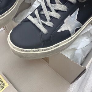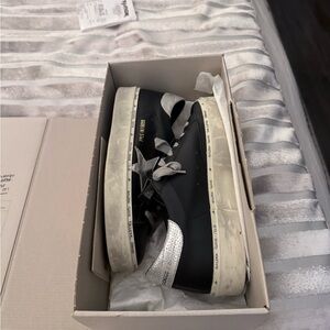 A metallic star patch and heel tab shine on a leather sneaker sporting an intentionally scuffed platform sole and handwritten lettering around the foxing. A soft terry lining makes it as comfy as it is cool.