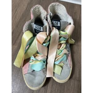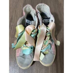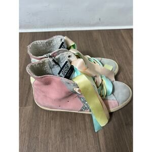 Golden Goose Deluxe Brand Francy High Top Sneaker, Made in Italy. Gray and Pink Leather with Silver Sparkle Star. Rainbow Ribbon Laces. Sz 40 (9.5-10)