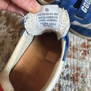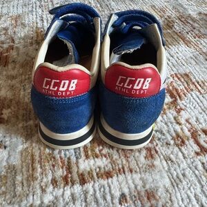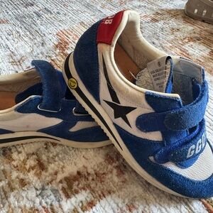 Vibrant blue sneakers with a bold black star. Red heel accent adds flair. Velcro straps for easy wear.