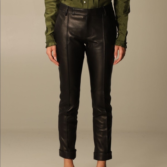 100% genuine leather pants. Fully lined on the inside as well. Low rise, posting more pictures soon. Would say it fits more of a size medium/28. I generally size up in Golden Goose pants.