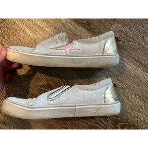 Golden Goose Limited Edition Hanami Slip Ons White with Pink Gold and Silver 39. These are in excellent condition, just have some opening where the big toe bone would be. This is easily fixed with glue or can be taken to a cobbler. Otherwise, please see photos for exact wear.