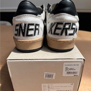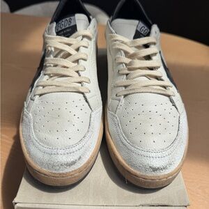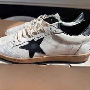 Stylish cream sneakers with bold black star. Golden Goose branding adds flair. Ideal for casual wear.